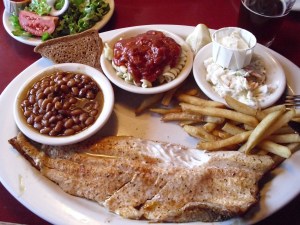 Lake Michigam Whitefish with baked beans, pasta (yes, really), coleslaw, rye bread, and fries.