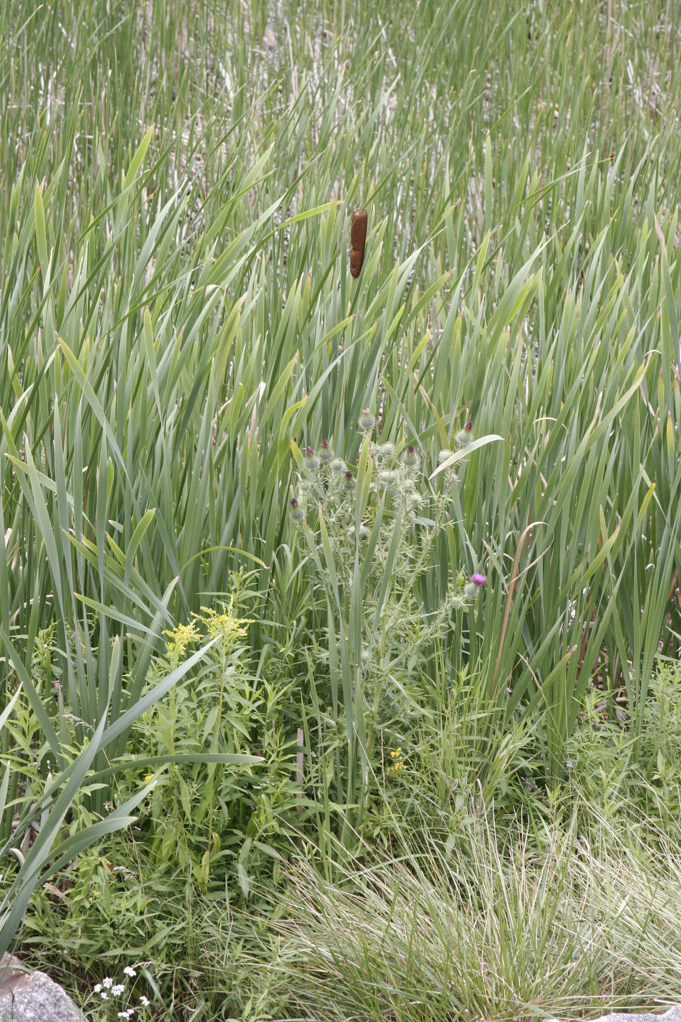 Much of the land is marshy. There are water lilies in the shallower waters, and bullrushes and thistles around the edges: