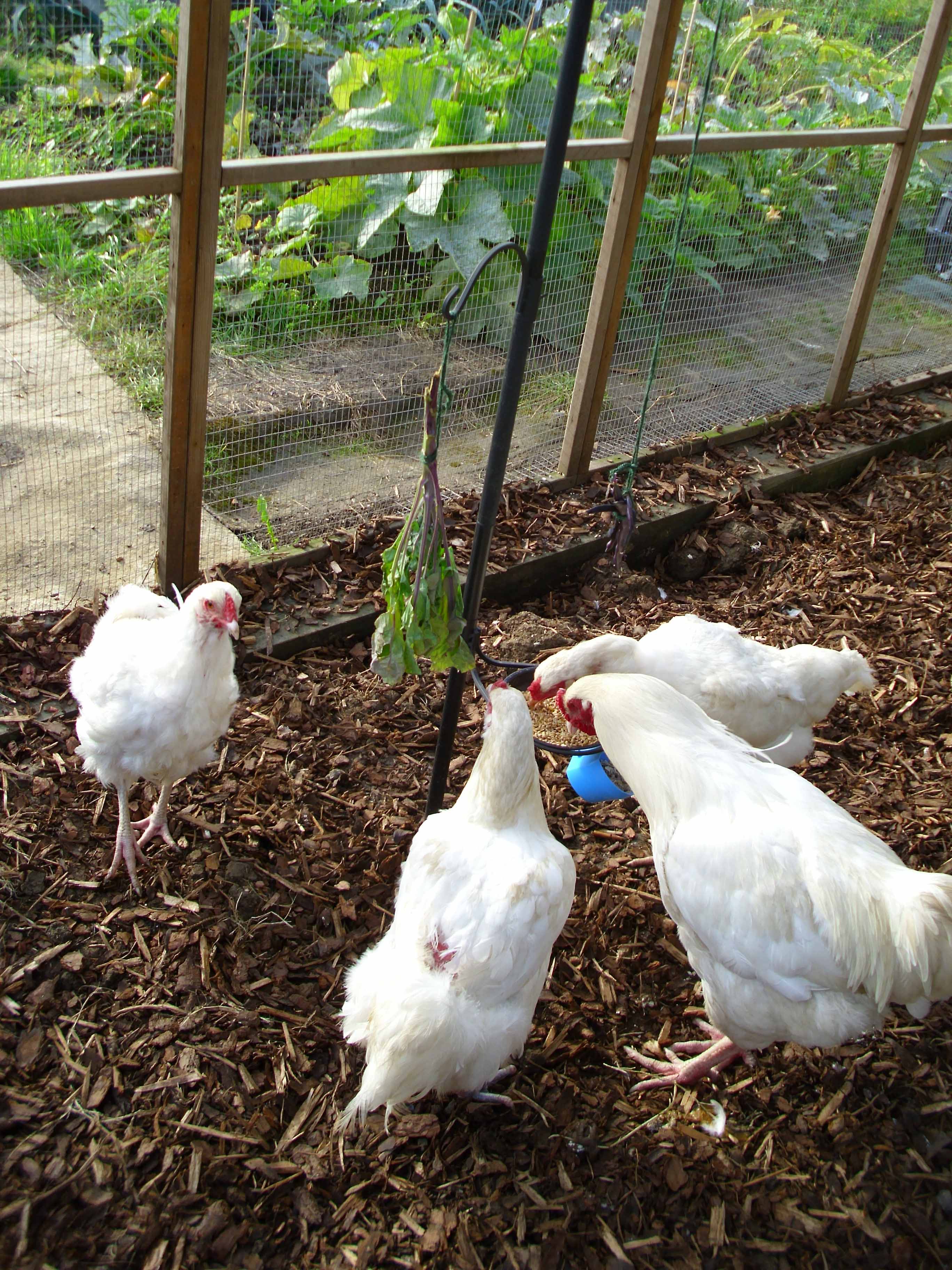 Apart from letting them out about 7am and closing the coop around dusk, we’ve been visiting them several times a day. At tea time they get their daily treats – mixed corn plus maybe a few mealworms, and some greens hung up for them to peck. We’ve installed a wild bird feeding station that we bought for the front garden. It was a failure as a wild bird feeder, since it was only too accessible to squirrels, but it’s ideal for the hens.