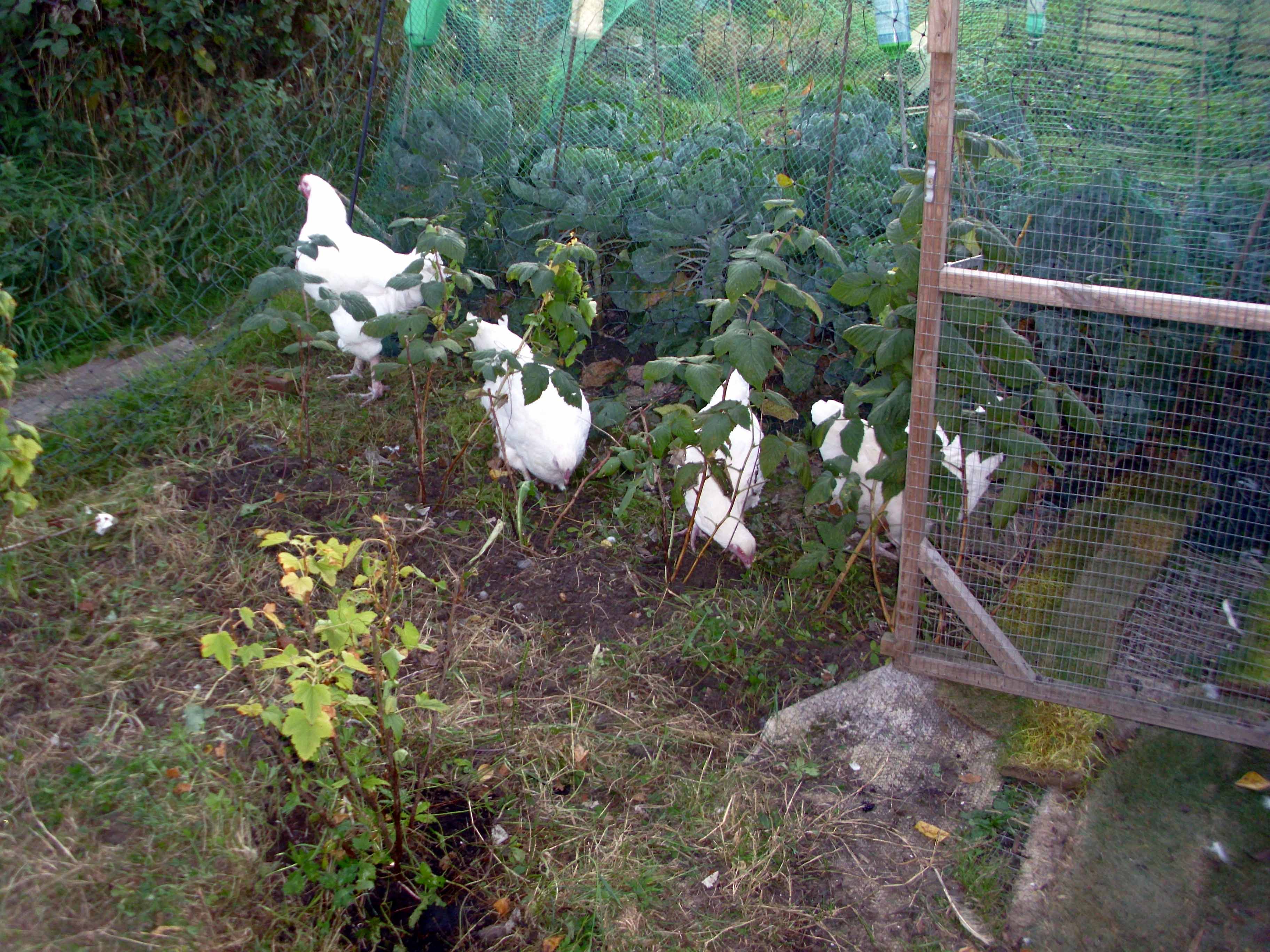 The chickens have been confined to the safety of their run in the 8 weeks since they arrived. They have plenty of room (12 square metres) but there’s no doubt that Ixworths love to scratch. So on Saturday we plucked up courage to allow them out. The reasons for our trepidation were that they are very reluctant to be caught and picked up, and we had no idea whether they could and would fly over our rather flimsy fencing and head off over various allotments wreaking havoc as they went.