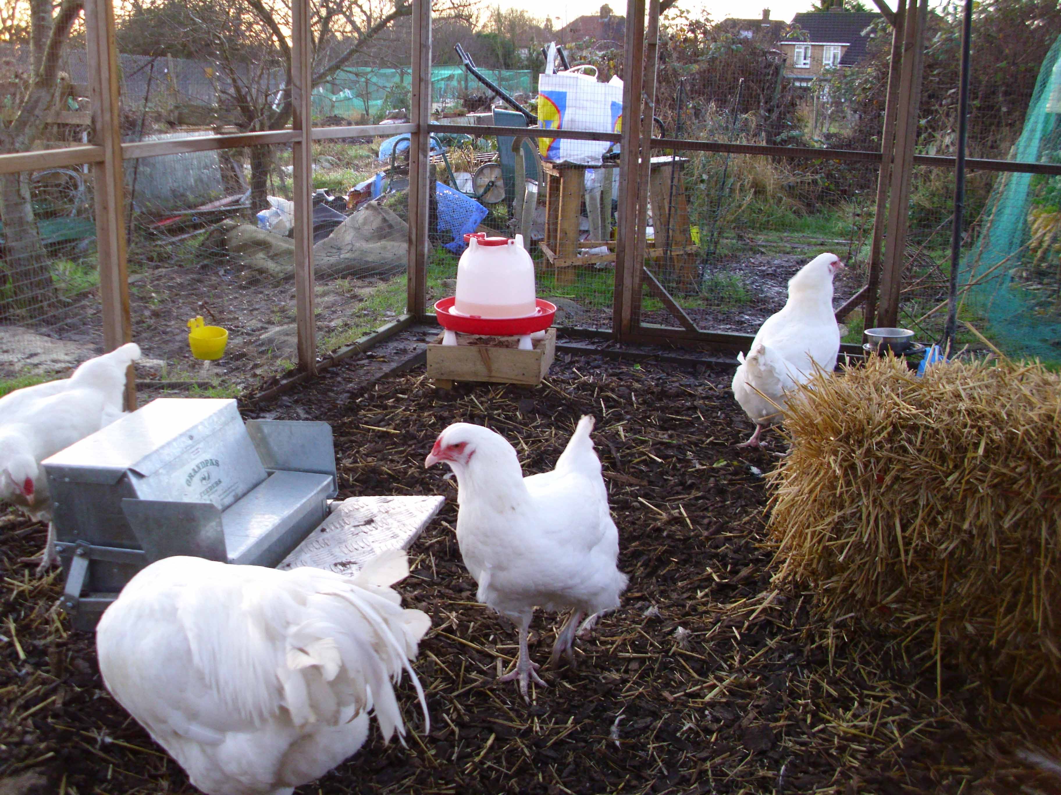 Only they didn’t. Only two of the four managed it, and the others survived on what the first two spilled. That’s not very satisfactory, so we reverted to more traditional feeders. I think the problem was that the chickens were too large for the rather restricted access to the feed tray, and perhaps also that they remained nervous of the clang when the lid opened.