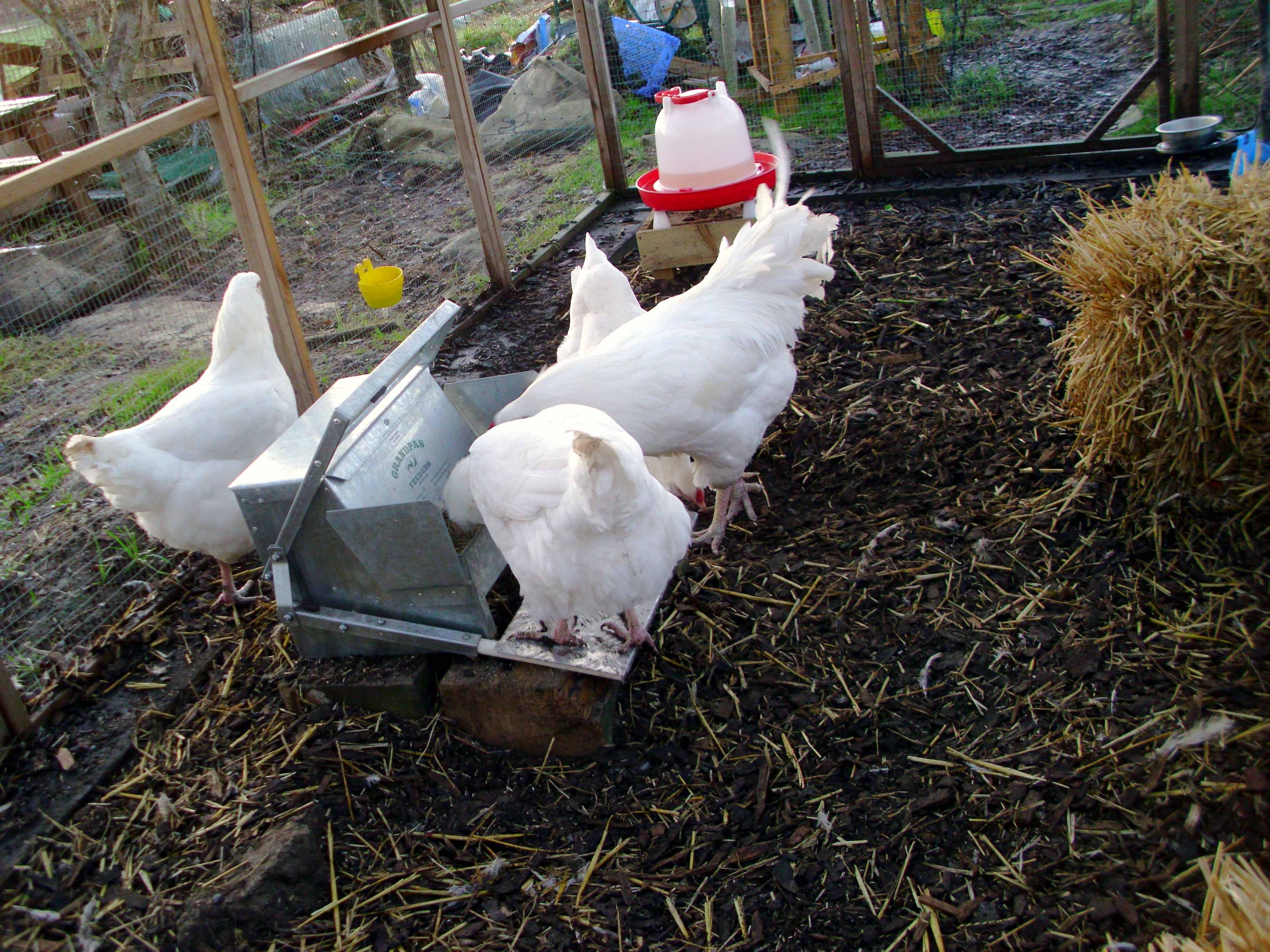 We had a lot of trouble trying to introduce the chickens to a treadle feeder. The one that we first bought was a cheapy – around £40. The idea of a treadle feeder is that it keeps the food clean and dry, and doesn’t present a temptation to vermin, while still making the food instantly available to the chickens.