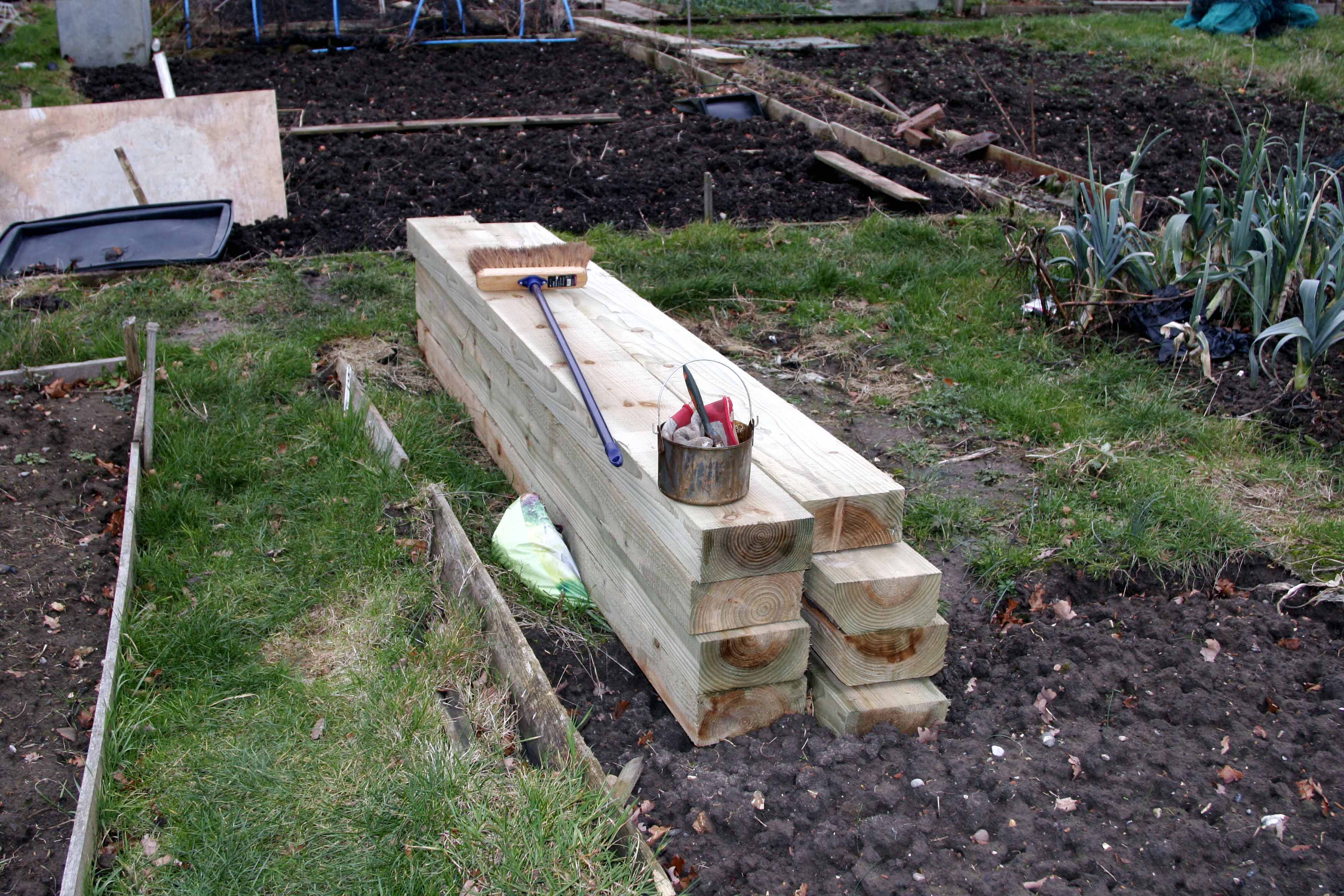 But before we get to the intricacies of gable ends and pitched roofs, the heavy work of digging and foxproofing the foundations must be done. We’ve acquired eight railway sleepers. These are new, but nothing like the weight of the reclaimed ones that we used last time. Heavy enough though. Here they are waiting for their first lick of creosote.