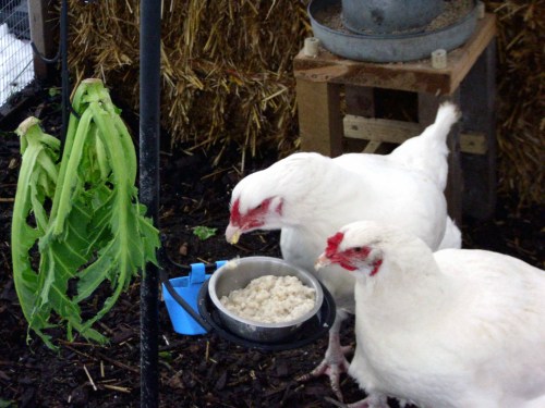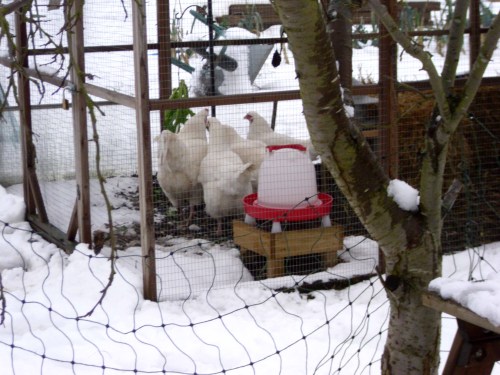 They hated the snow. I understand that most chickens do, although there are exceptions. Even sunflower seed kernels wouldn’t tempt them.