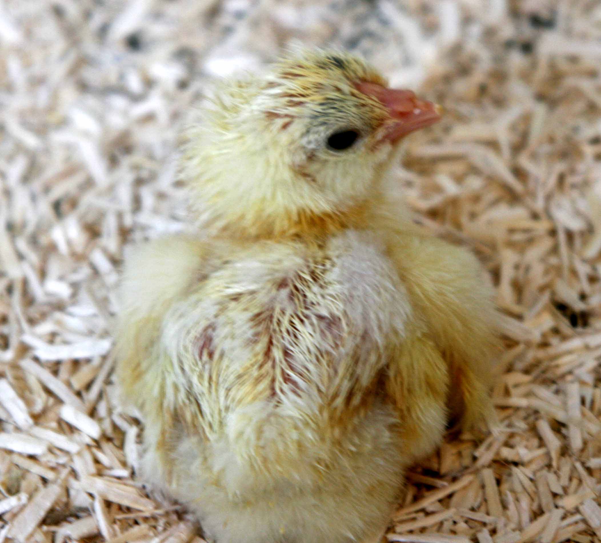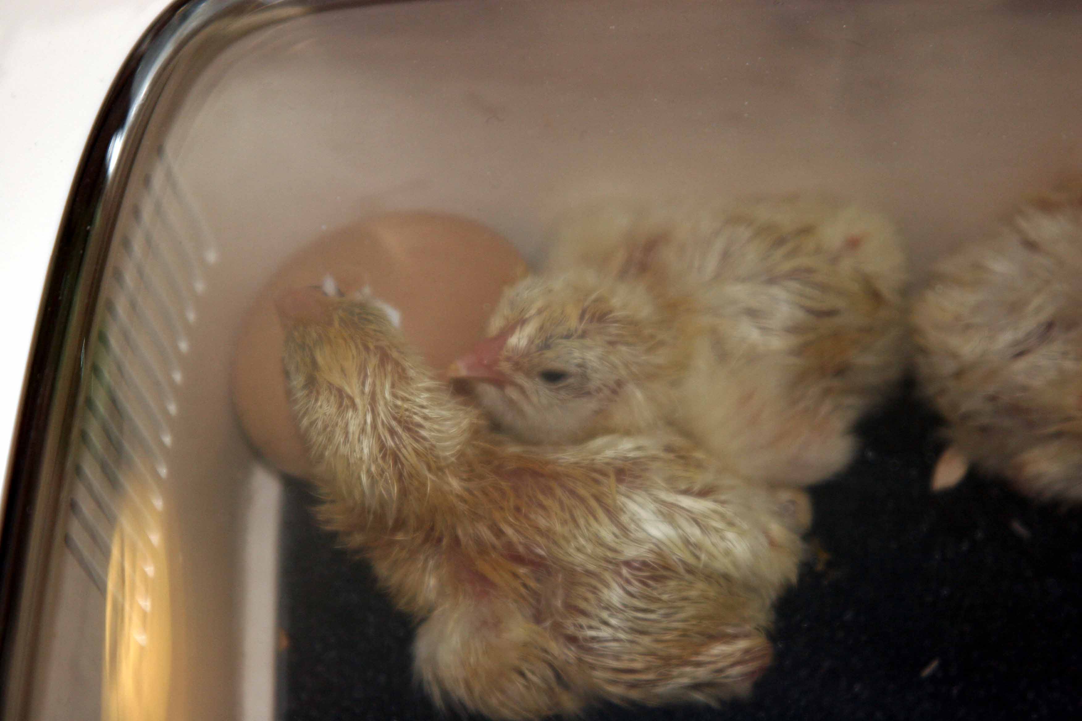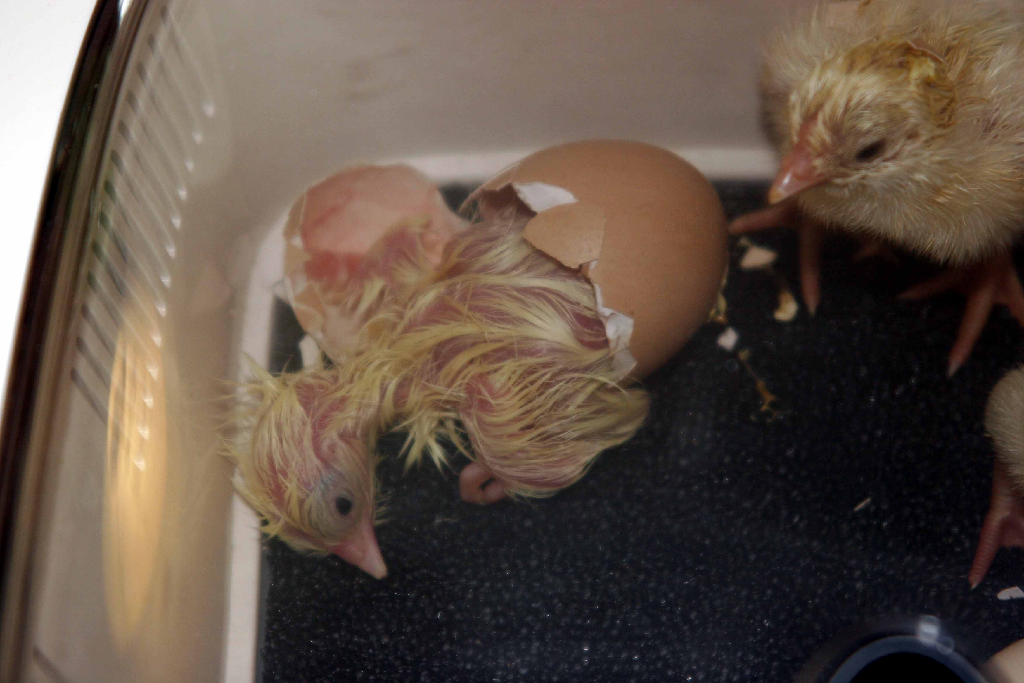 … then the small hole in the shell extends, and suddenly the chick pushes his way out. The newly hatched bird looks a bit bedraggled, since he’s still damp from the egg, but the warm moist air from the incubator very soon has him looking smart.