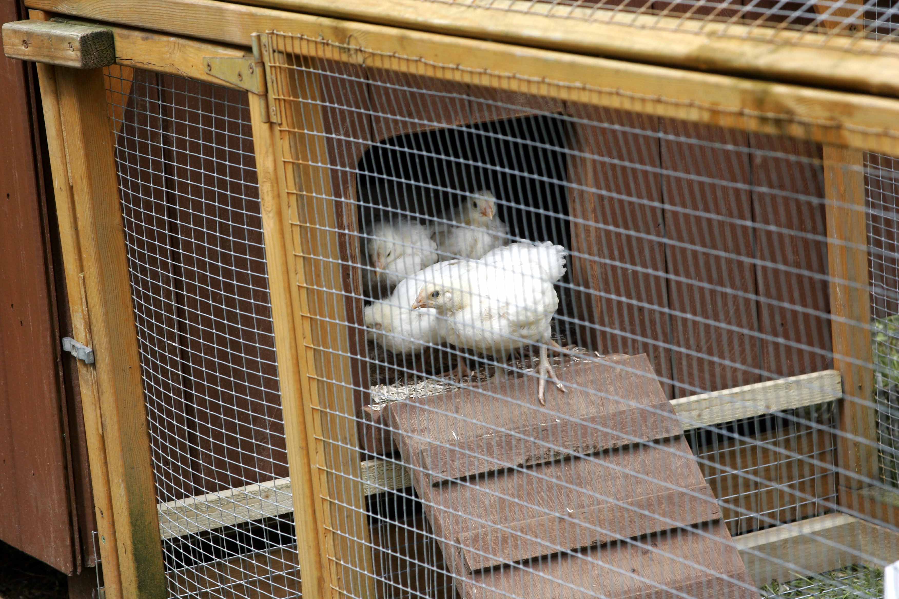 Anyway, they had a lovely time on their first day in their new home. It was a pleasant enough spring day, with no rain, although it got a bit chilly at times. We noticed that they tended to seek shelter under the ramp up to the house rather than in the house itself. And sure enough, when evening came, they clustered round the door of the run, waiting to be taken back inside to the warmth and comfort of the brooder and the electric hen.
