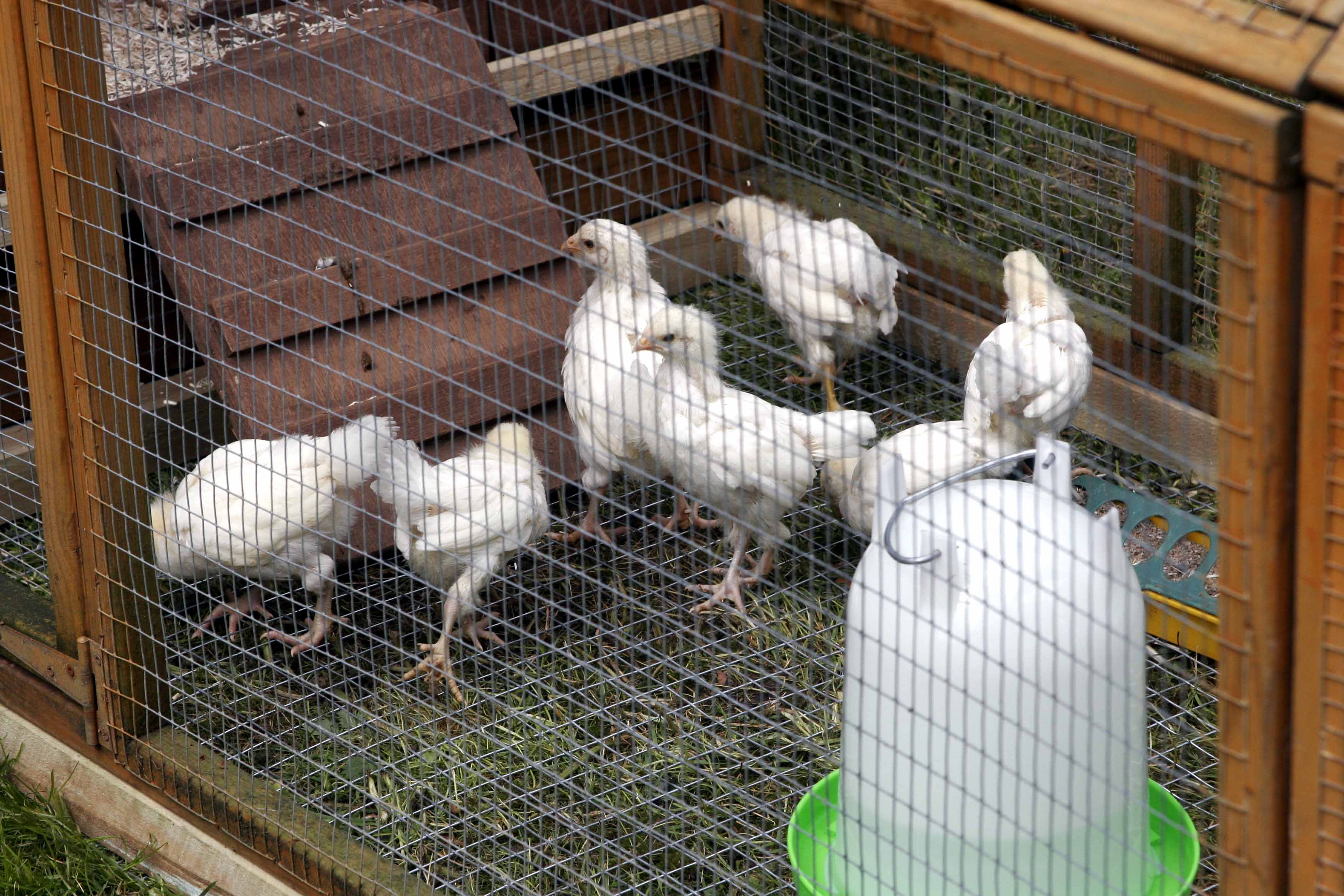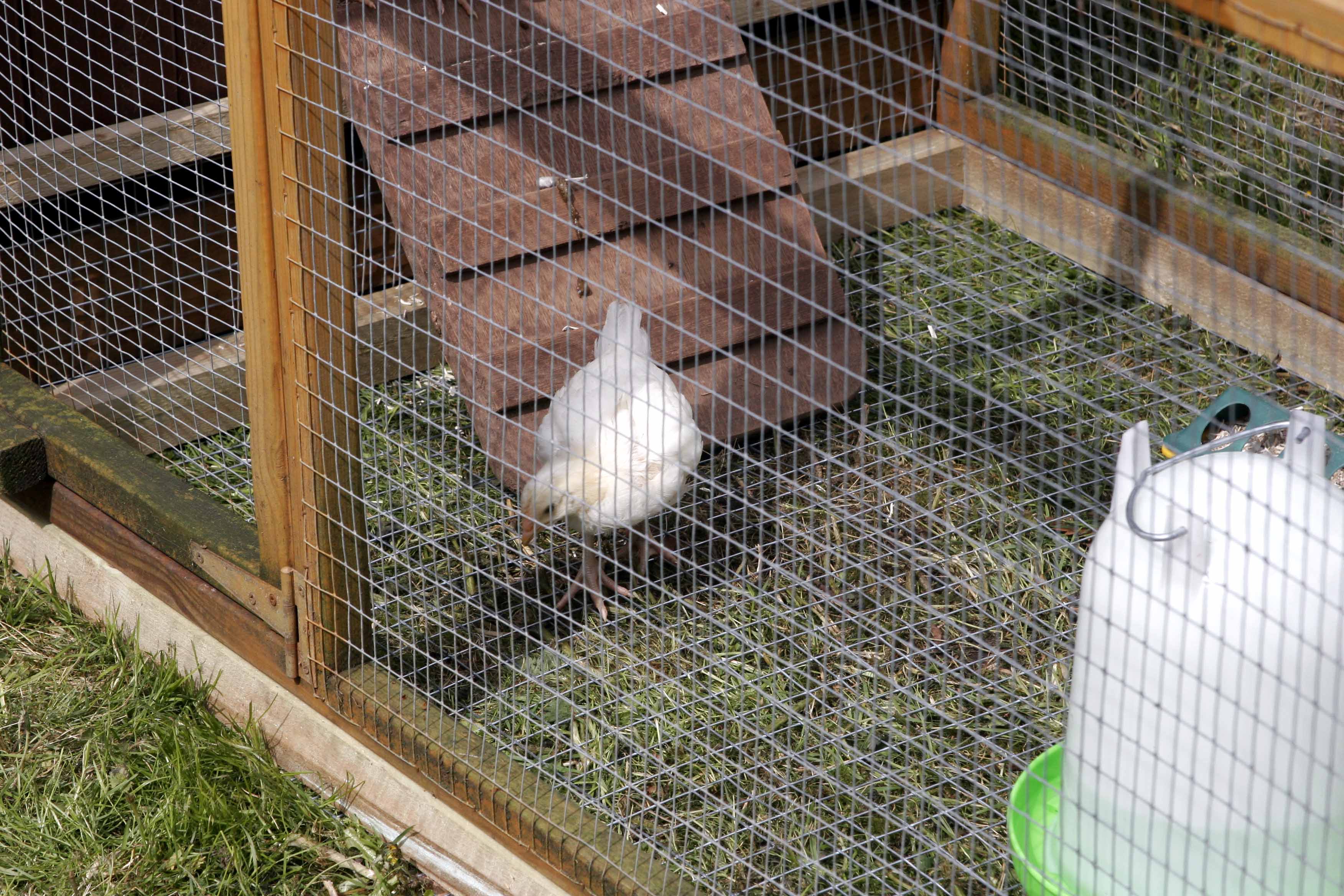 We got the run secure on Sunday, but delayed putting the chicks in until Monday, since it was forecast to freeze overnight. We’re still very inexperienced, and weren’t sure how robust our 3 week old chicks would be. We certainly didn’t want to come down on Monday morning to find eight pathetic little frozen corpses!