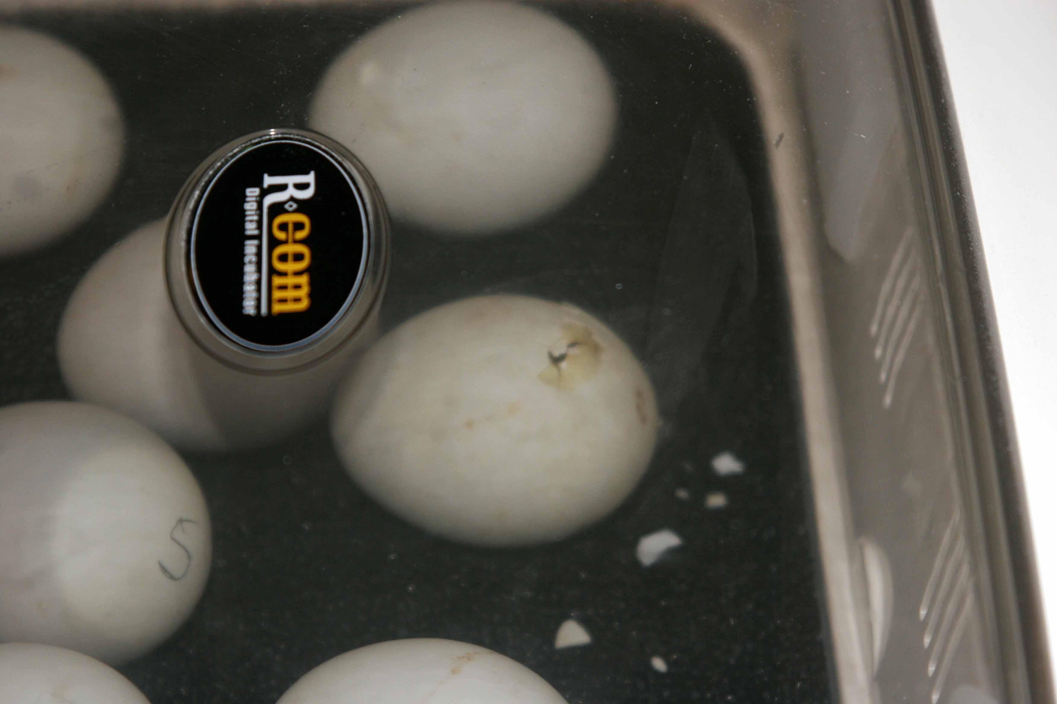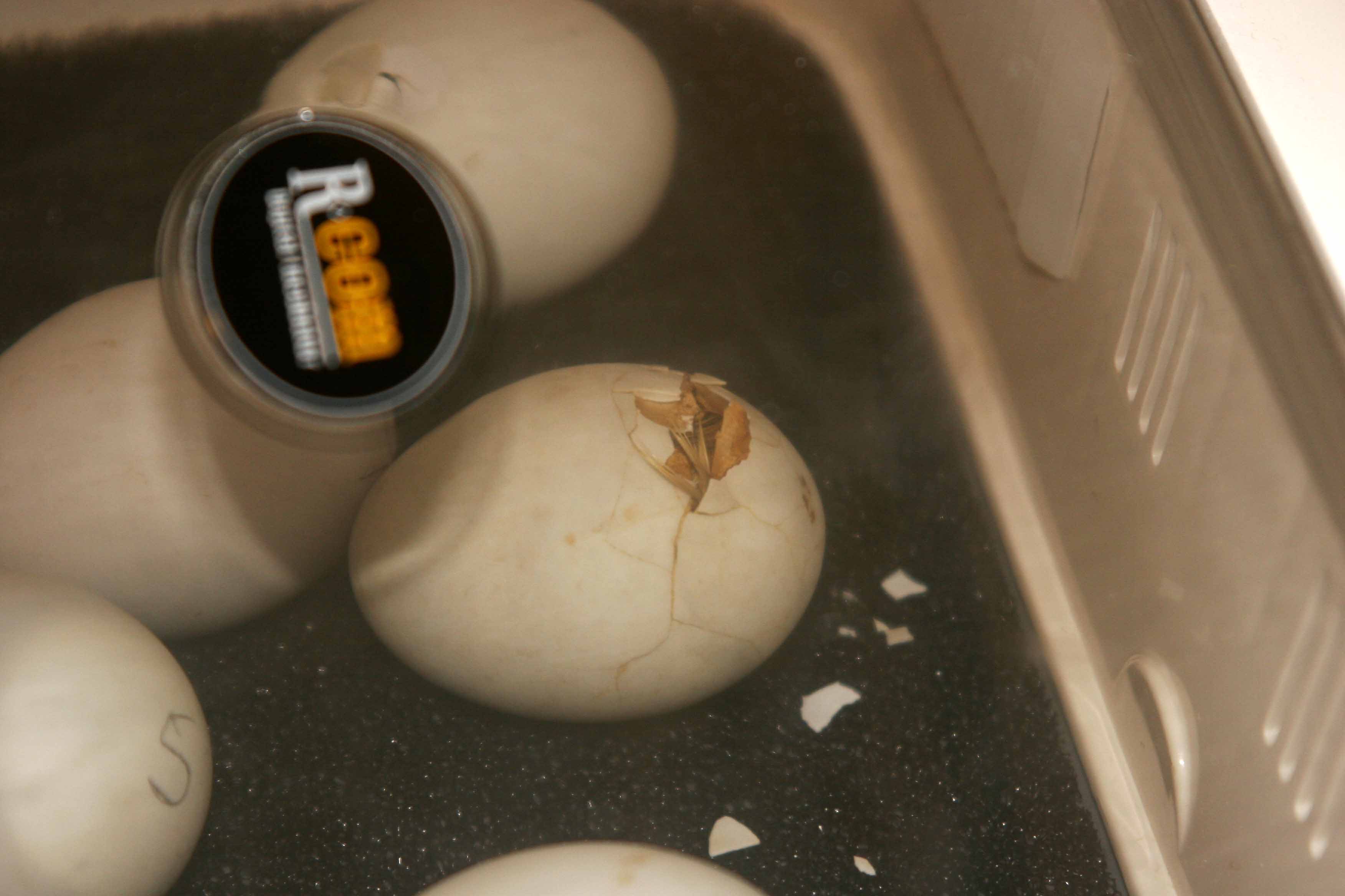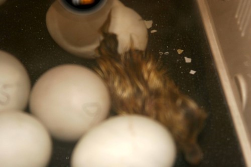 We noticed that one of the eggs had “pipped” this morning. By afternoon, there were two more. Here’s the egg that has hatched first.