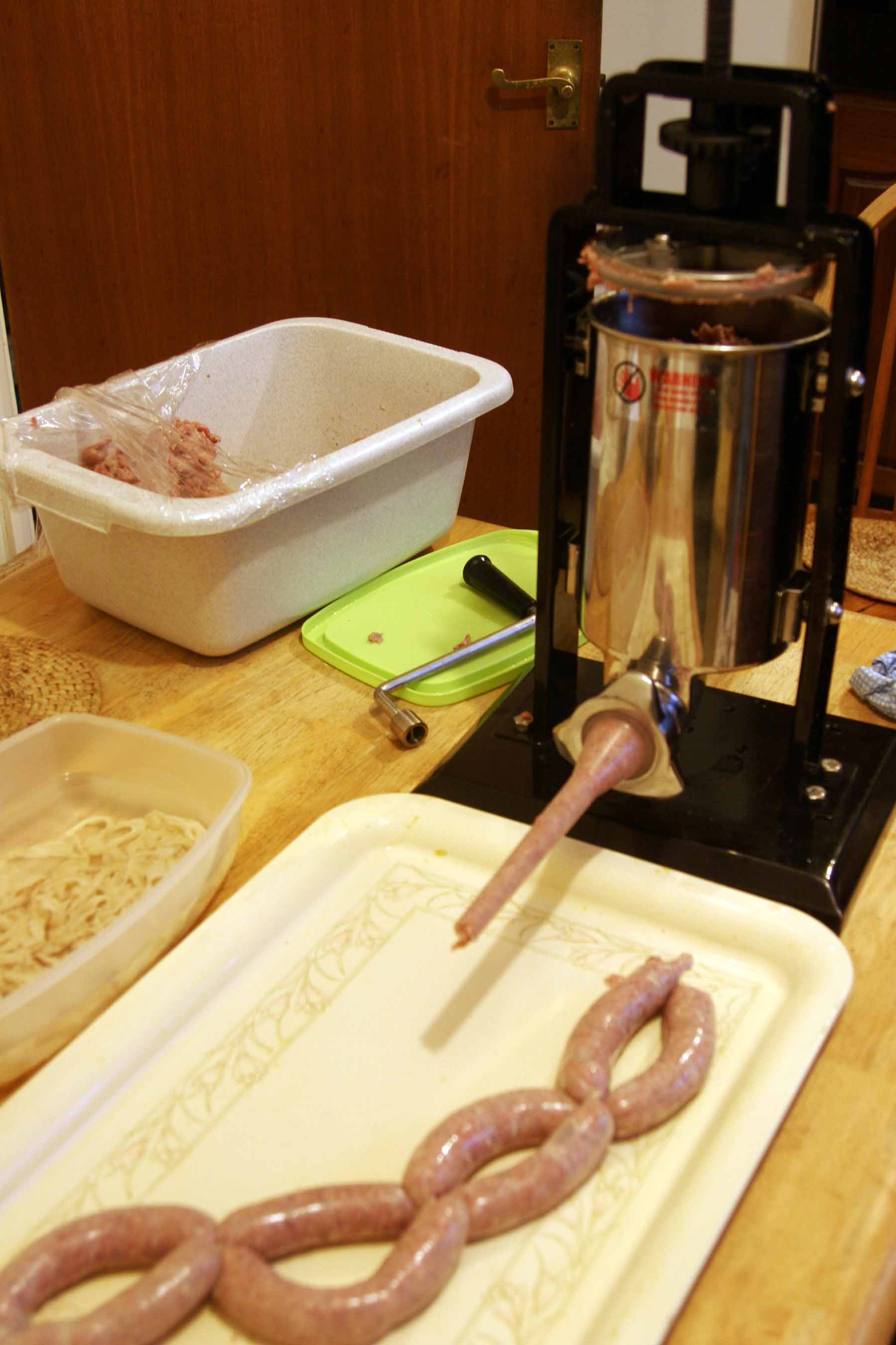 Many years ago, we used to make our own sausages. Then a series of house moves and a very busy time in both our lives forced a pause in such hobbies. But I remember the product with some fondness, and thought it was worth having another go. Our small mincer and sausage stuffer had long ago disappeared, so with my fondness for gadgets, I bought replacements albeit secondhand on eBay. This time I’ve got a mincing attachment for the Kenwood mixer, and a rather larger stuffing machine.