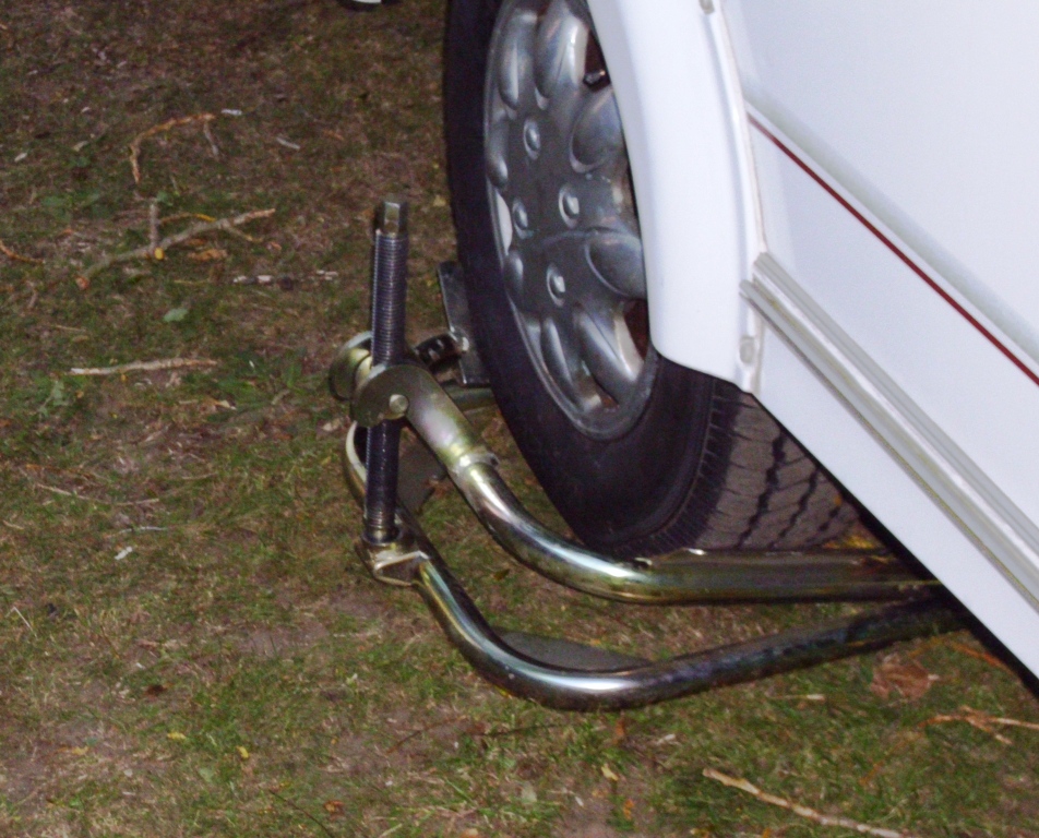 Back on site we had one last small job with the caravan. When we’d set up, we’d selected a flat pitch, and the spirit level showed the van more or less level. Well, we soon learned that more or less isn’t good enough. The shower and the sink didn’t drain properly. So another eBay bargain came into its own. This Bulldog leveller is really easy and precise.