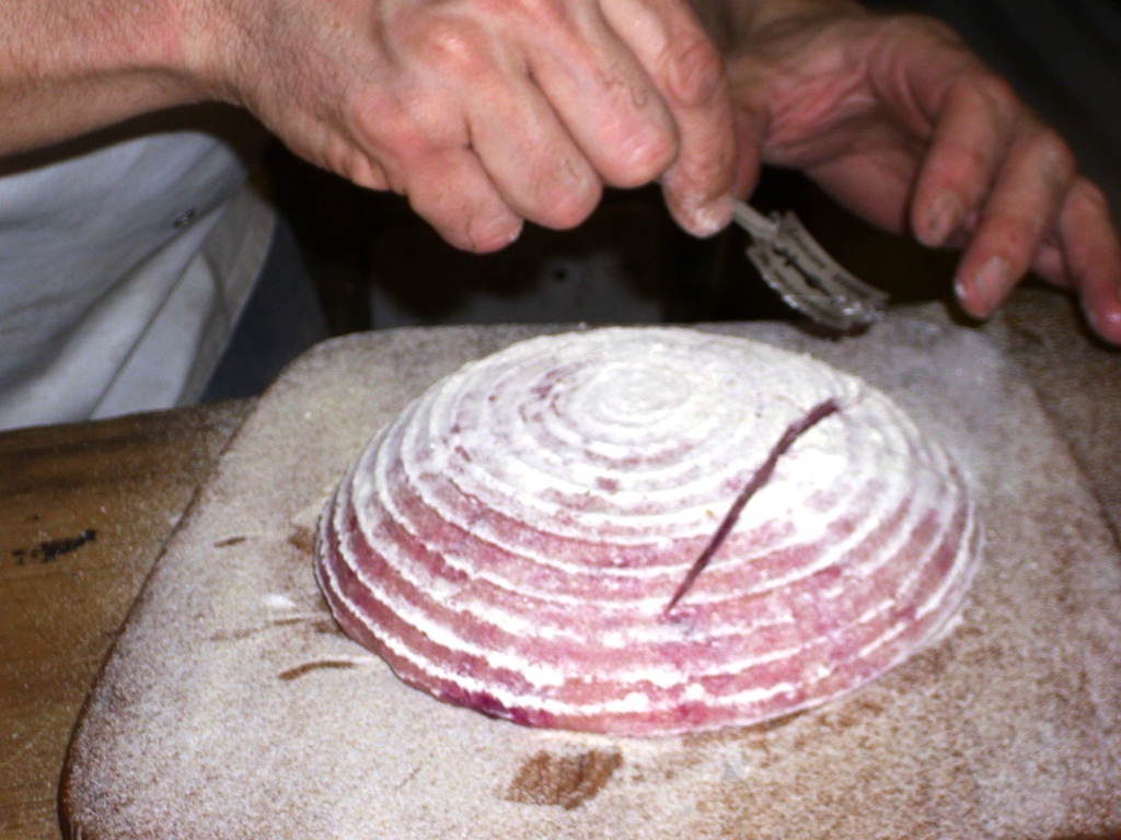 Having turned the loaves out of their bannetons, they’re slashed with a “lame” so that the dough springs nicely in the oven.