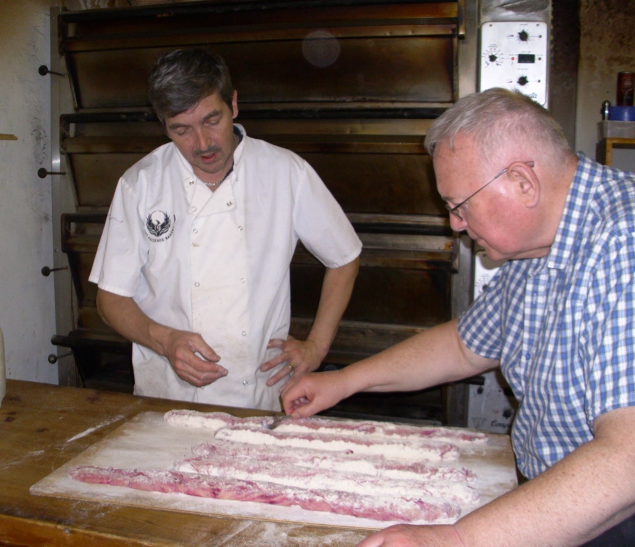 Much refreshed, we rejoined Aidan Chapman in the bakery, where our beetroot and spring onion loaves had now proved. Here Aidan is demonstrating how they should feel when they’re ready for the oven: