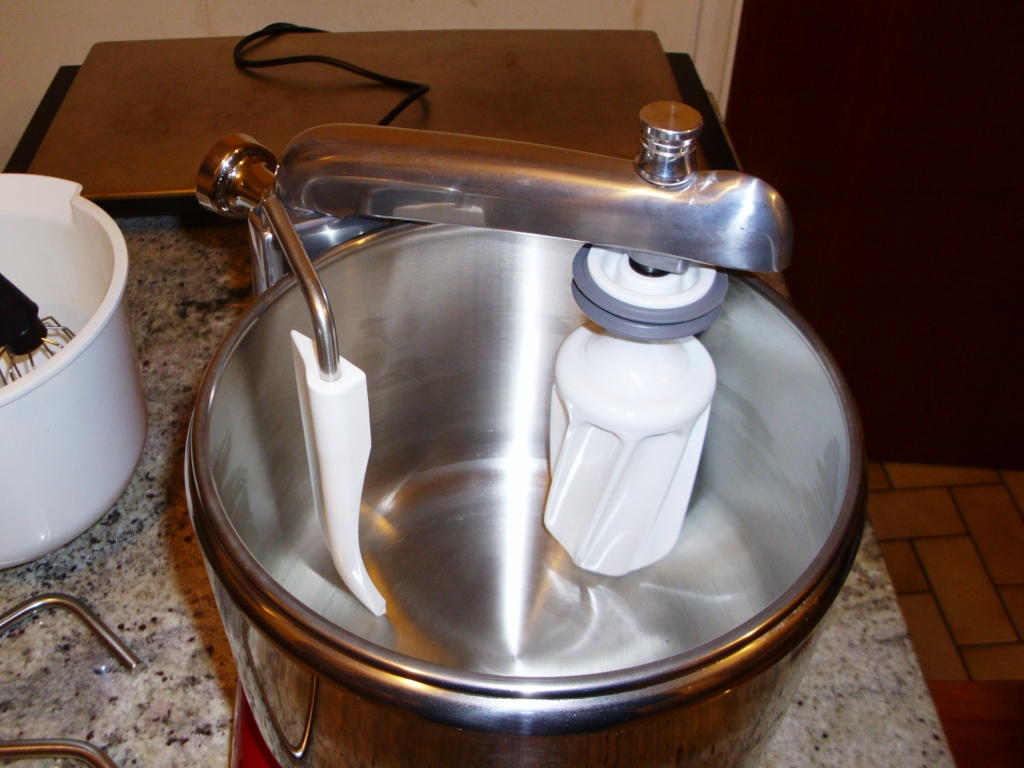 It works differently from the usual stand mixers. Instead of a moving dough hook or beater moving inside a fixed bowl, the hook is static, and the bowl rotates. Actually, the dough hook isn’t quite static, since it can move against a spring to position itself nearer the edge of the bowl when the mixture is loose, or nearer the centre of the bowl as the mixture develops and thickens.