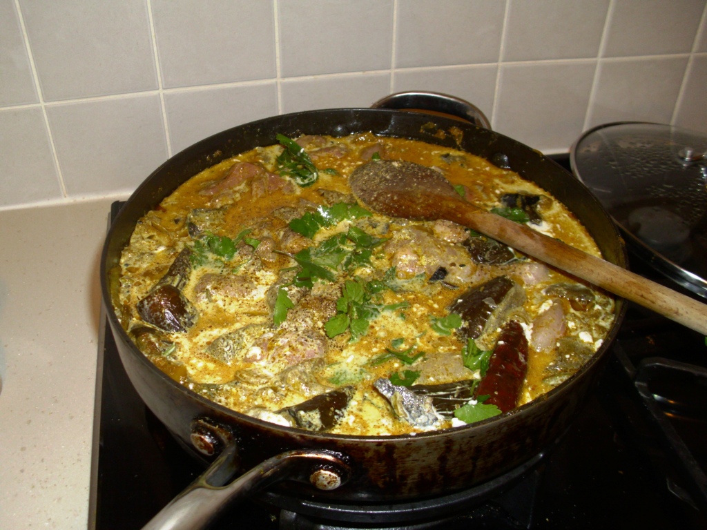 Final assembly consisted of adding the cooked aubergines (including their juices), trimmed and chopped chicken thighs (raw), salt, black pepper, chopped coriander leaves, and coconut milk.