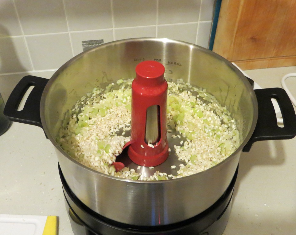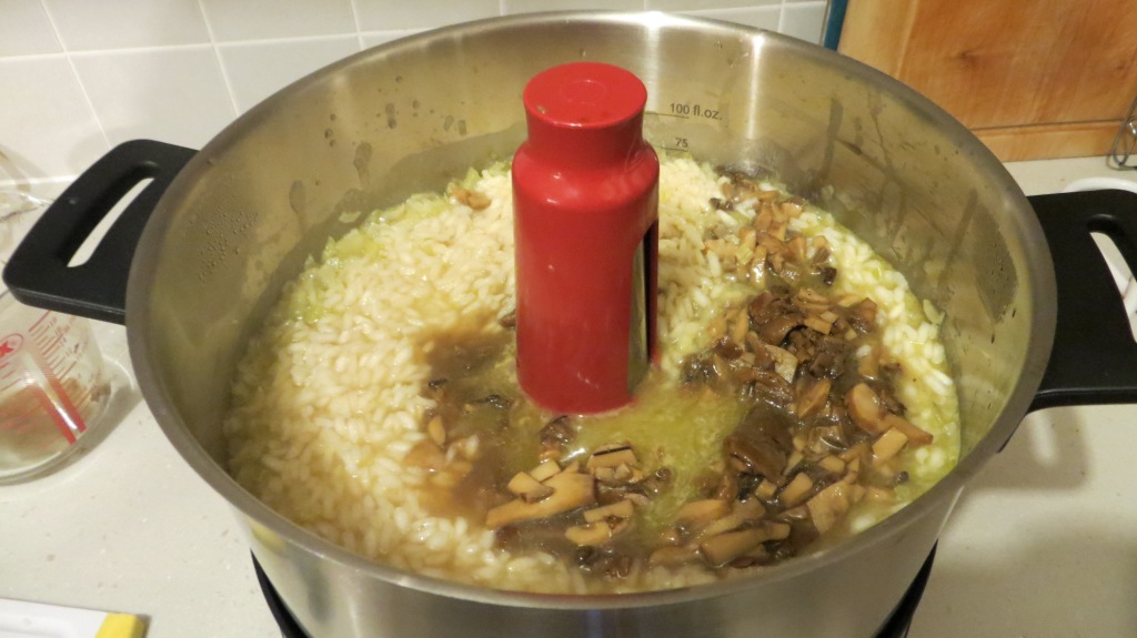 One of the standard tests of these gadgets is risotto. Jean fancied a mushroom risotto, so I prepped the ingredients and off we went. Apologies for the shop-bought stock, but I wasn’t about to invest too much time in what might turn out to be a disaster. And since this is Jamie Oliver, not Gordon Ramsay, I have to say things like, “Go in with a glug of olive oil”, rather than swear loudly and throw knives.