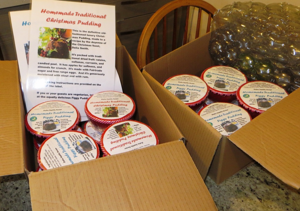 For inspiration, we turned to the ever-reliable Delia. We made 10 rich Christmas Puddings and 10 Figgy Puddings. The main difference is the type of dried fruit. The Christmas puddings are made with raisins, sultanas, currants, and peel. Figgy puddings contain dates, figs, raisins and crystallised ginger.