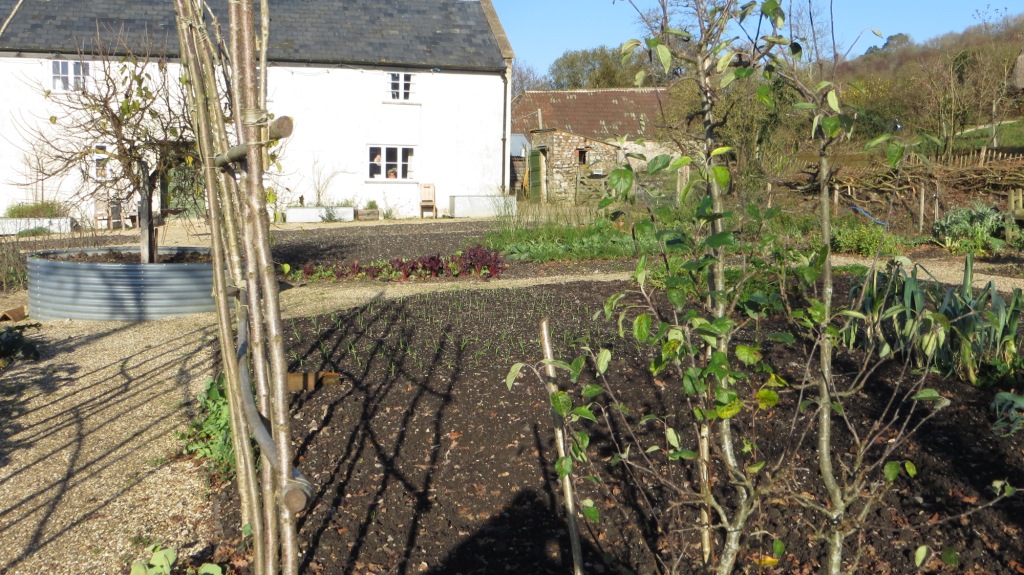 We broke for a delicious and rather too plentiful lunch. Roast loin of pork (of course) with smashed root veg and kale, followed by apple crumble and ice-cream. And a walk round the kitchen garden to admire what can be grown even at this time of year.