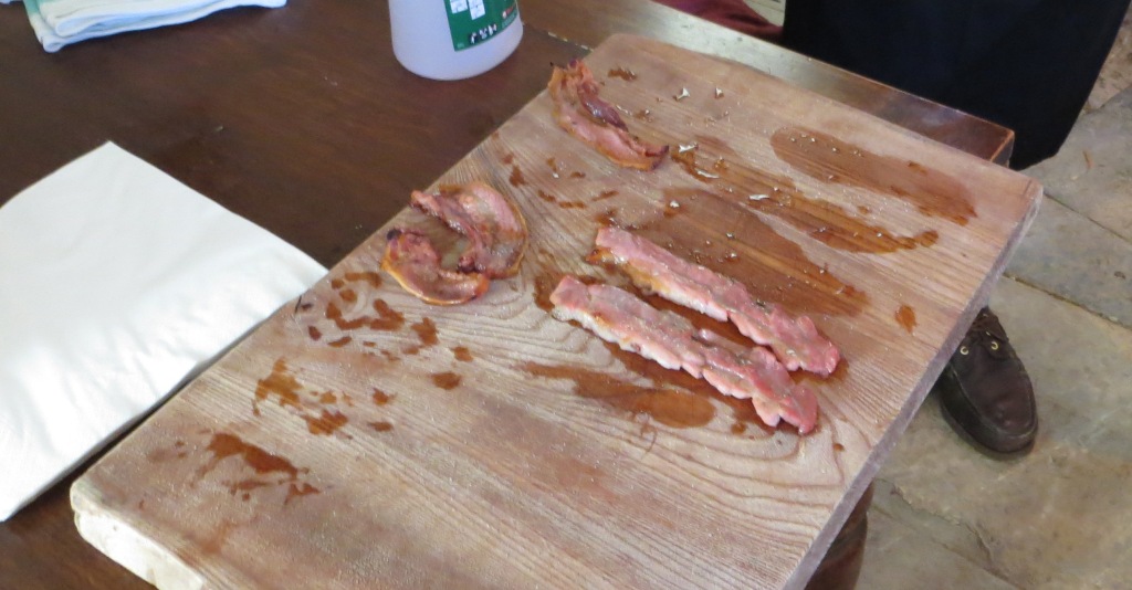 Then it started. Little “tastes” started to appear, some of things that we’d just made, others, like the bacon in the next picture, that had been prepared earlier. The small pieces of bacon are from the cheeks, the longer pieces from the belly.