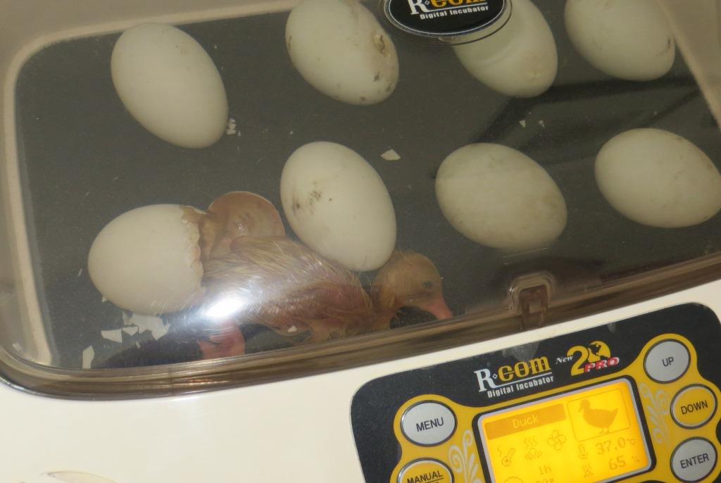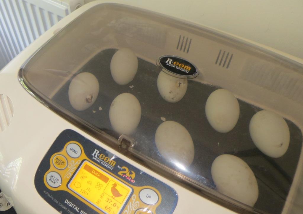 Last time we attempted to hatch ducks, we had a fairly low success rate, so we’re hoping for better this time. Our R-com 20 incubator has a digital program for different types of eggs, but the duck settings have a humidity of 60% during the final hatching phase, whereas most advice seems to be anything up to 75%. As a compromise I’ve set it to 65%, so we shall see what happens.