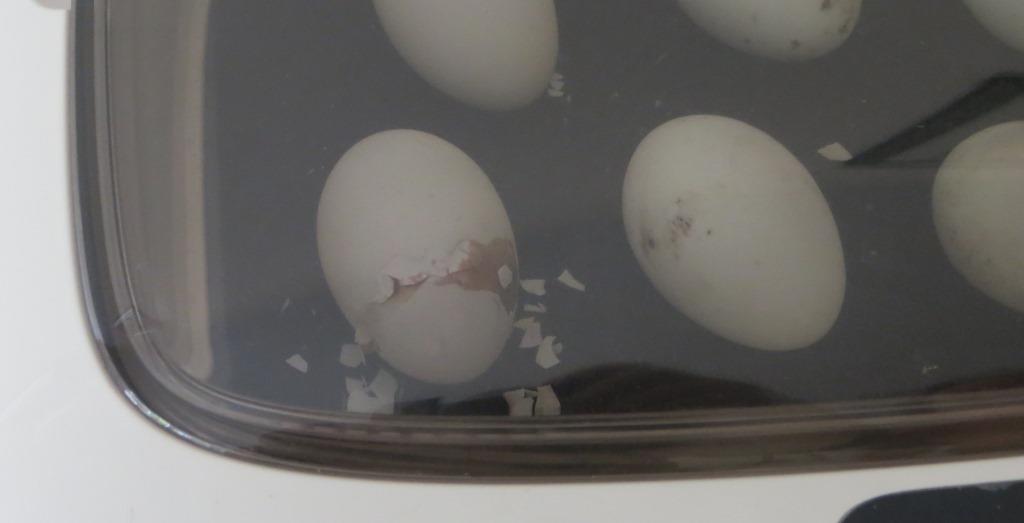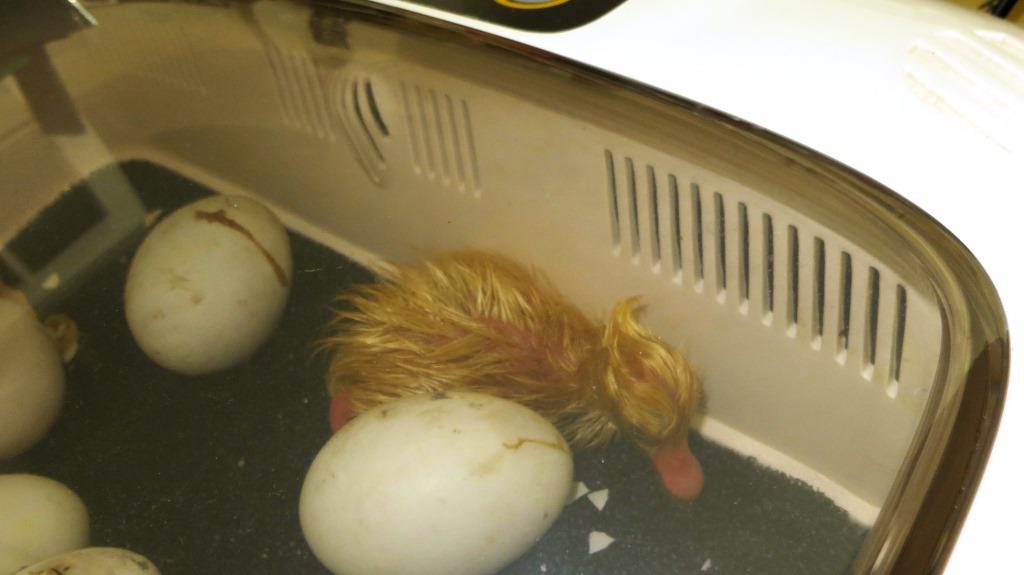 We’re hatching a clutch of duck eggs for a friend at the allotments. When we last checked, 8 out of the original 11 were still viable. The first surprise came yesterday afternoon, when the three-day hatching phase commenced. A couple of eggs had already started to pip, 48 hours earlier than we would have expected. You can see the first little chips in the shells as the ducklings start to hatch.