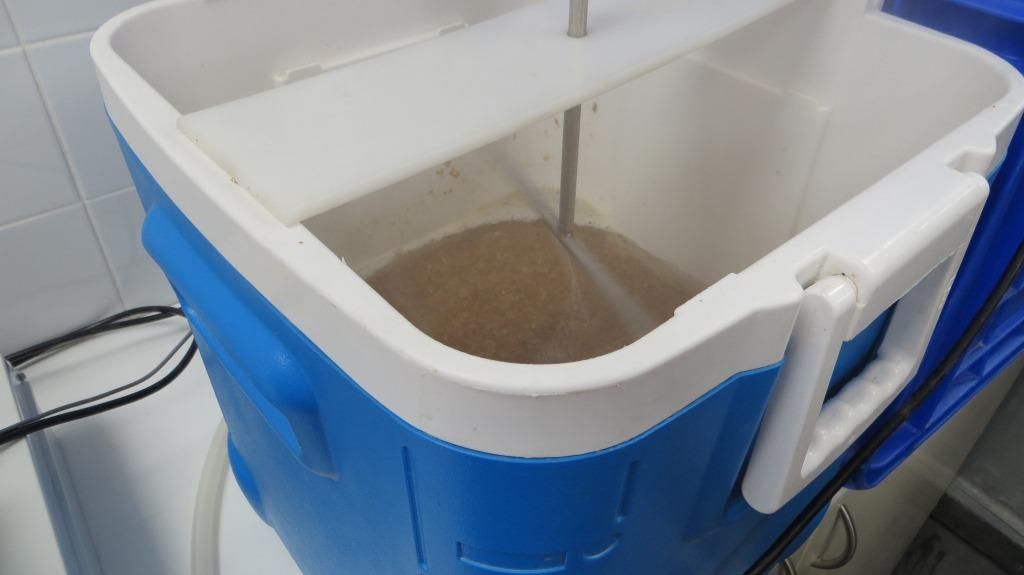 Adrian’s coolbox mash tun was fitted with a rotating arm sparger, so that the remaining sugars were rinsed from the grain with a fine spray of fresh water.