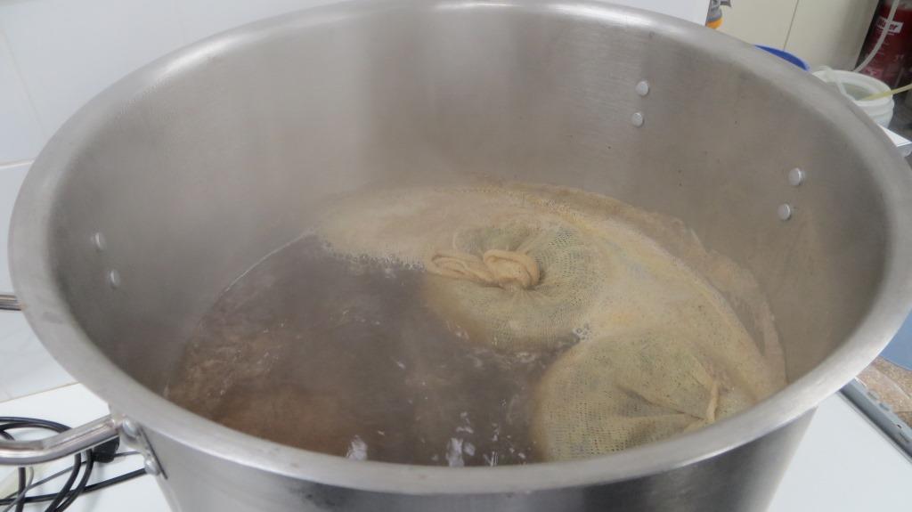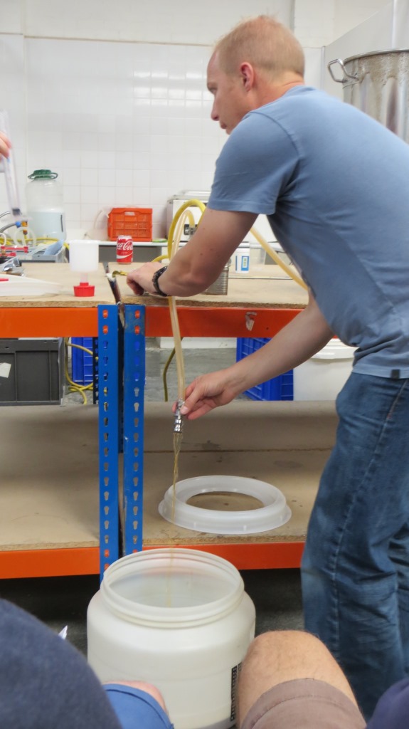 Once the mash had finished, the wort could be transferred to the boiler. The stainless steel mash tun had the more sophisticated filter plate, and so after returning the first couple of jugs to the mash, the wort ran clear.