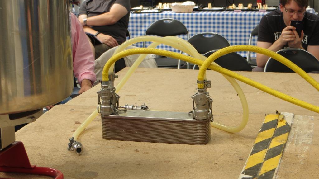 The final session of the course demonstrated the methods of cooling the boiled wort ready for pitching the yeast. You can of course simply let it cool naturally, but this risks infection, and also may lead to protein hazes. So cooling is highly desirable.