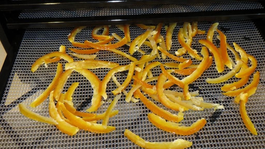 6. Dry at 135F for 7 hours. Peels will still be a little bit soft, ideal for cooking. You could dry more to get a “brittle” texture. Dip peels in caster sugar if desired (we don’t).